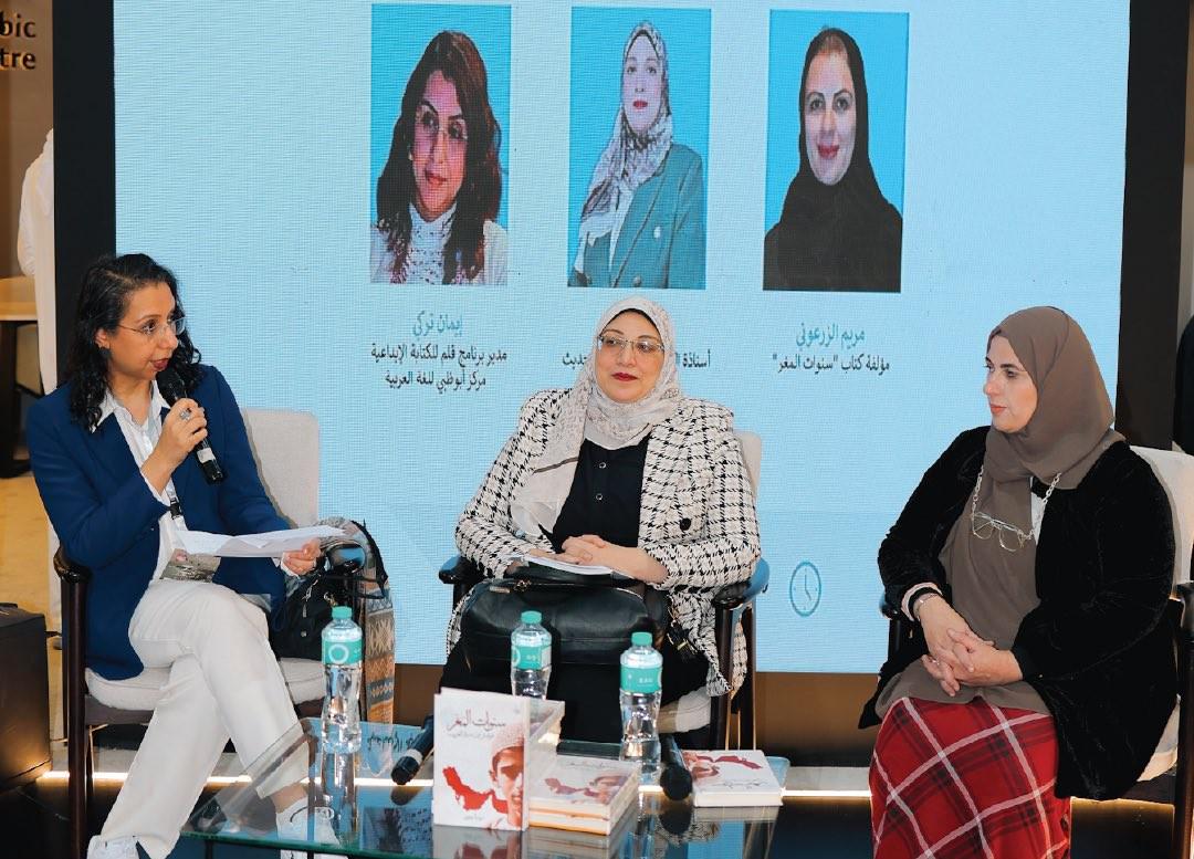 الكاتبة مريم الزرعوني خلال ندوة الاحتفاء برواية "سنوات المَغَر" في القاهرة.