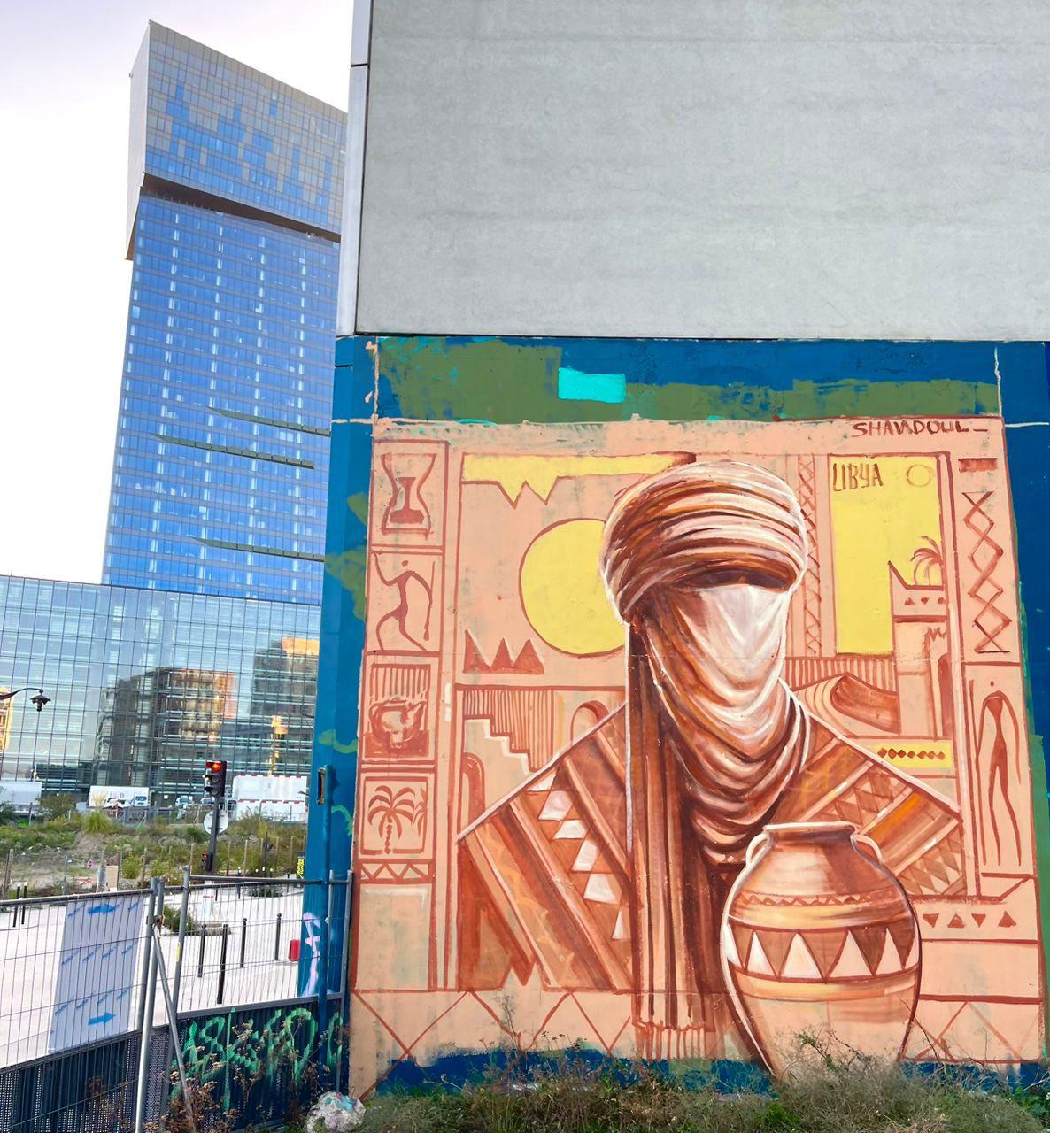2. الجدارية الثانية: انتقل الفن إلى الشارع بباريس، حيث تزين جدارية شندول مساحة “Spot 13” الشهيرة لفنون الشارع، محولة جداراً إسمنتياً إلى لوحة تحكي قصة الصحراء الليبية للعابرين.