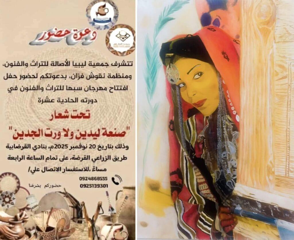 أعلنت جمعية ليبيا للأصالة للتراث والفنون، بالتعاون مع منظمة نقوش فزان، عن تنظيم الدورة الحادية عشرة من مهرجان سبها للتراث والفنون، والذي ينطلق يوم الخميس 20 نوفمبر 2025 بنادي القرضابية، عند تمام الساعة الرابعة مساءً، تحت شعار «صنعة ليدين ولا ورث الجدين».