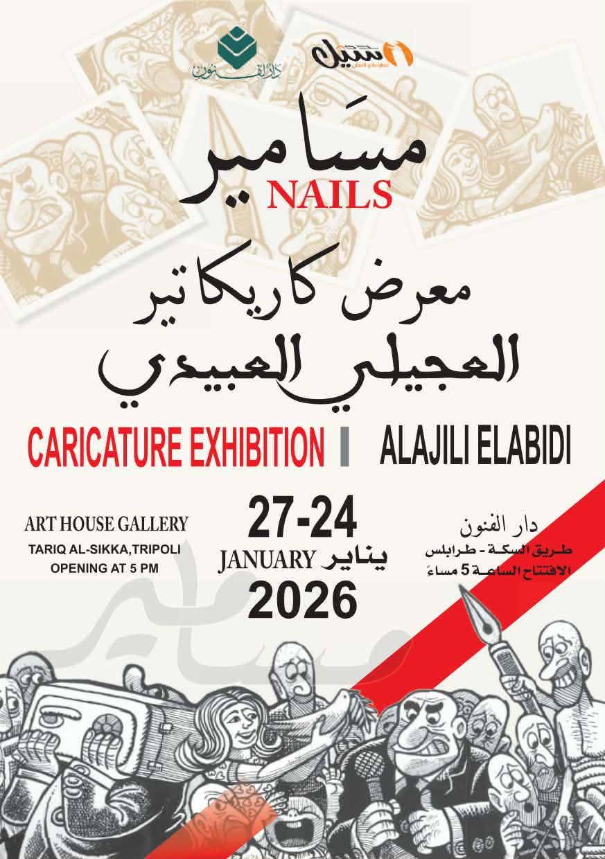 تستضيف دار الفنون بطرابلس معرض الكاريكاتير «مسامير» للفنان العجيلي العبيدي، وذلك خلال الفترة من 24 إلى 27 يناير 2026، في Art House Gallery بطريق السكة، على أن يكون الافتتاح مساء السبت 24 يناير عند الساعة الخامسة مساءً، بحضور نخبة من الفنانين والمثقفين والمهتمين بالفنون البصرية.
